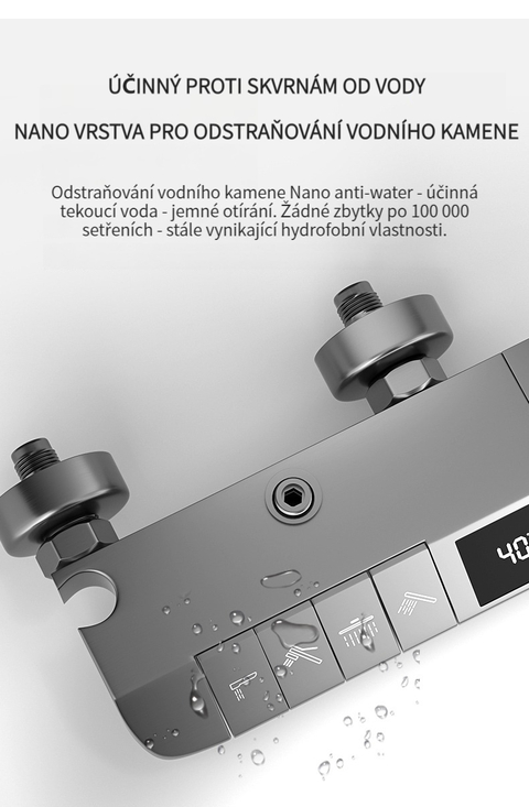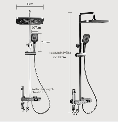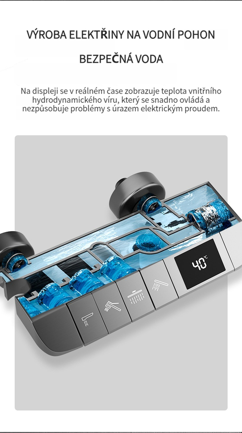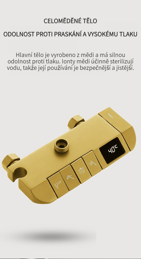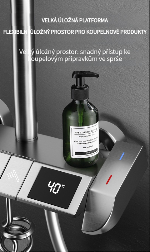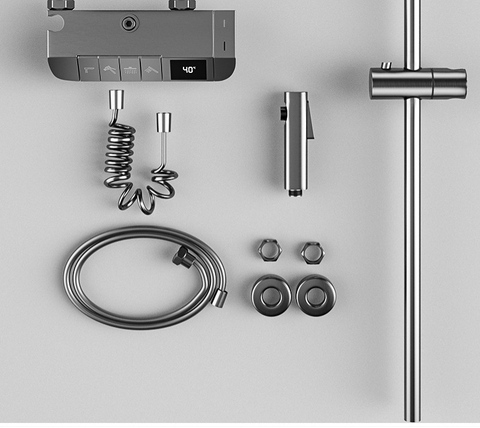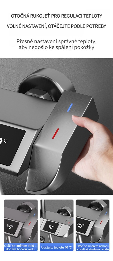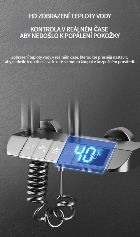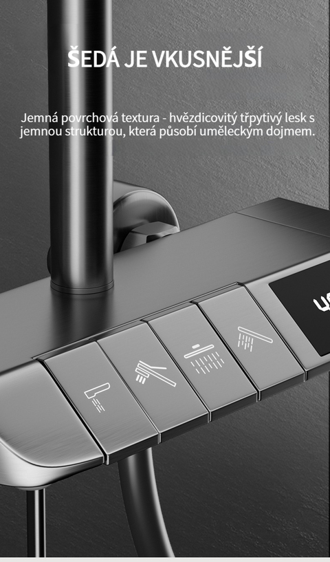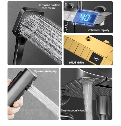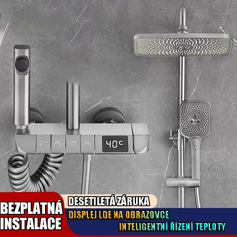 Multifunkční domácí sprchová souprava s klavírními tlačítky, digitálním ukazatelem teploty a rukojetí pro horkou a studenou vodu.